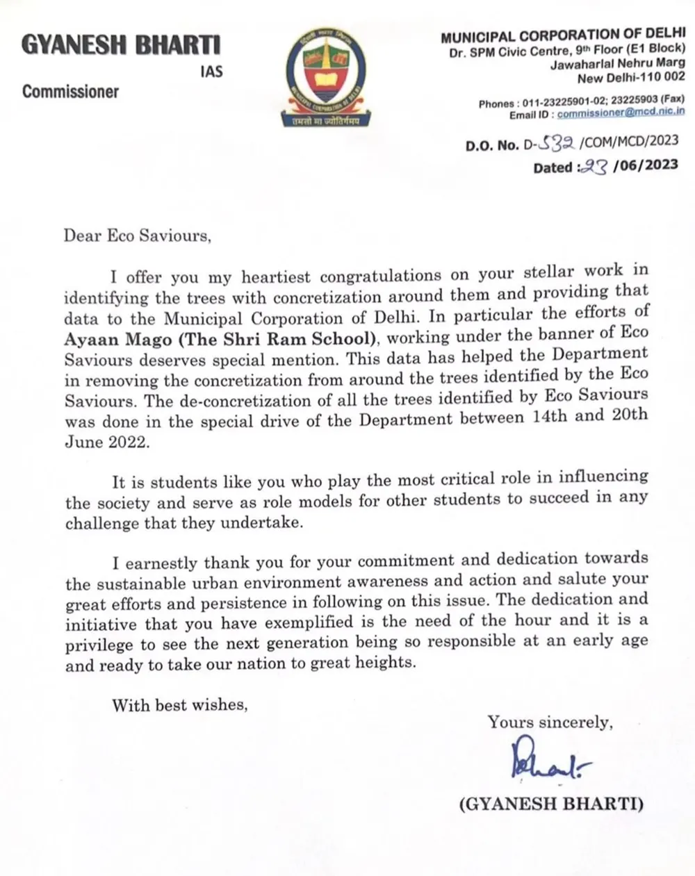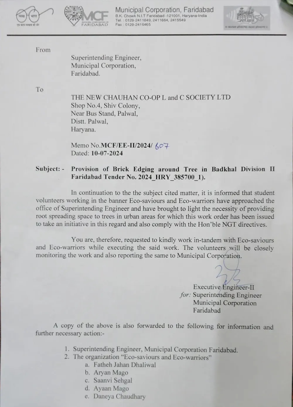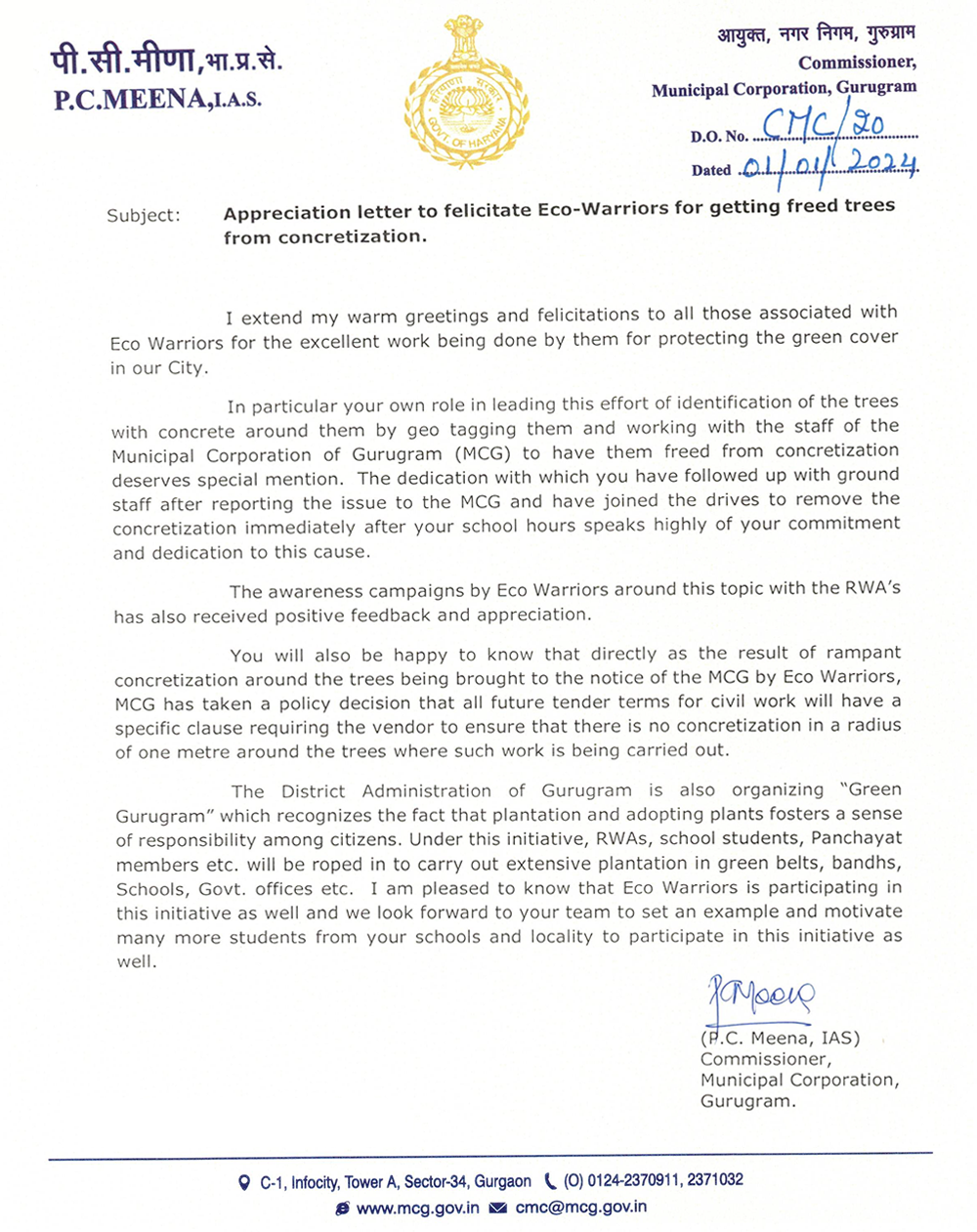 Instrumental in getting the Municipal Corporation of Faridabad to float a tender for 5.86 lakhs to De concretise the trees